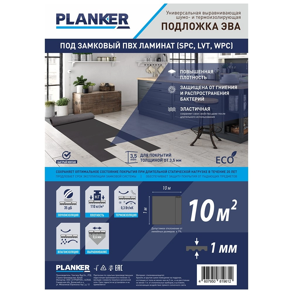 Подложка Planker EVA в рулоне под замковый ПВХ-ламинат SPC/LVT/WPC (рул.10м2) 1мм